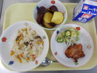ハムコーンピラフ、マーマレードチキン、パインサラダ、「おおきなおおきなおいも」のおさつチップス、牛乳