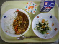 カレーライス、ツナと水菜のサラダ、フローズンゼリー、牛乳