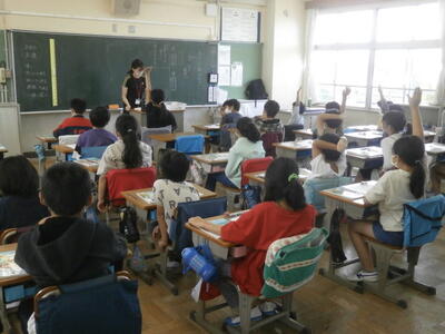 【4年 教科担任制授業】3組担任の先生が、2組で道徳の授業を行っています。クラスごとに違う意見や反応が出ることは先生にとっても勉強になり、子どもたちもいつもと違う雰囲気で新鮮な感じで取り組んでいます。