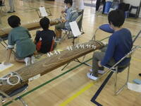 クラスごとに体育館で、講師の先生に教わりながら、琴に触れてみました。