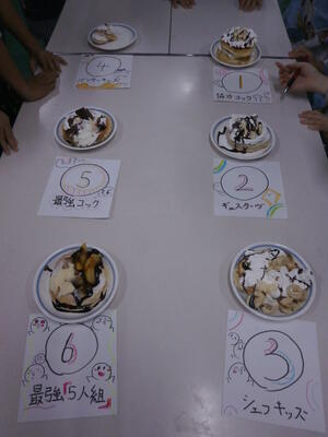 パンケーキ対決(5年生) 投稿日時 : 16:34 鶴指小学校管理者 対決形式の調理実習を行っていました。 すべてのチームの作成したパンケーキはこちら。 一番人気は①の「協力コック」チームのパンケーキです。