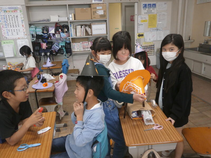 3年生の図工科で「ハロウィンの帽子」を作っていました。