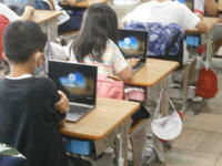 【1年 タブレット】いよいよ1年生にもタブレットが配布され、ICT支援員の先生に教わりながら操作を学んでいます。