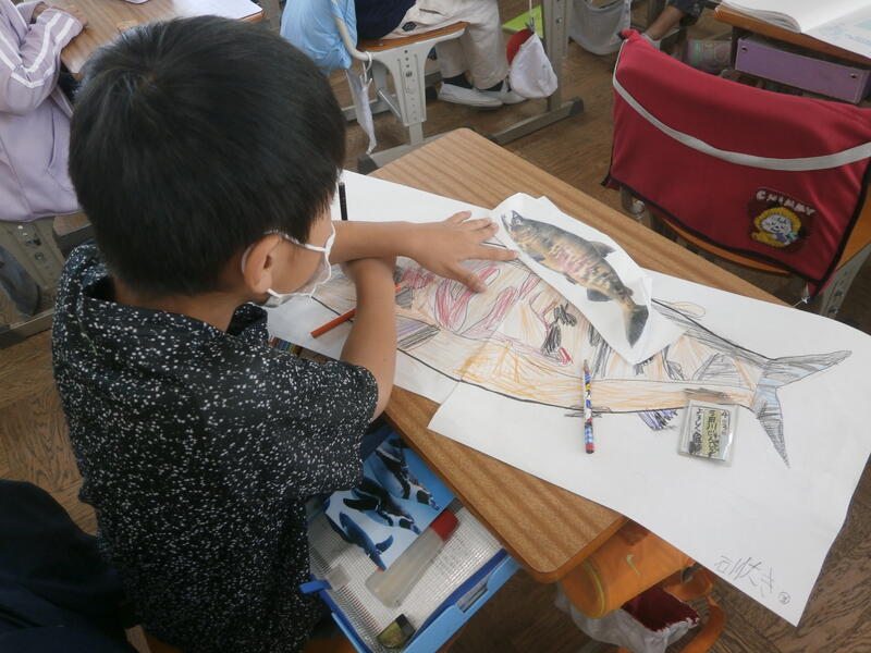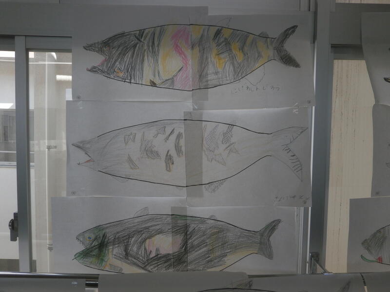 授業あれこれ 投稿日時 : 2023/10/20 鶴指小学校管理者 10月20日(金) 2年生が国語科「さけが大きくなるまで」の学習で 本物と同じ大きさのさけを描いていました。 いっぱい並ぶと迫力があります。