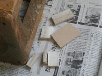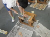 【3年 図工】のこぎりで木材を切っています。小さな木材は押さえにくく、切るのに一苦労でしたが、みな頑張っています。