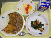 5月27日(金)の給食 投稿日時 : 2022/05/27 一般 カレーライス、ひれ勝つ!、トマトとわかめのマリネ、紅白フルーツポンチ、牛乳 ※写真は4年生の量です ★ランチタイムだより 今日は運動会応援メニューです。 ゲン担ぎの「ヒレ勝つ!」や玉入れのボールをイメージした「紅白フルーツポンチ」が登場です。また豚肉には、体の疲れをいやすビタミンBが豊富です。今日は早く寝てしっかり体を休め、明日に挑みましょう!給食室から応援しています