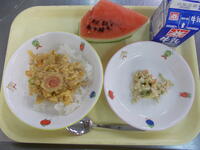 あぶたま丼、キャベツのゴママヨネーズ、冨里のスイカ、牛乳