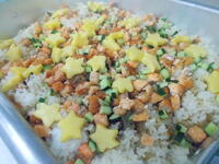 かきあげは、いろいろな具材を衣の中でかき混ぜて、ひとまとめにして揚げるため、この名前がついたといわれています。今日はしらす・大豆・にんじん・みつば・さつまあげ・玉葱の6つの食材をつかってかき揚げにしました。甘辛いタレがしみて、ごはんがよく進みます。