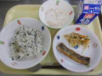 わかめごはん、いわしのレモンソース、ナムル、フルーツヨーグルト、牛乳