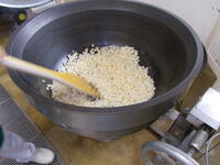 まず納品された梨を1㎝角に切り、大きな窯に入れ砂糖・レモン汁を加えて
