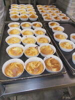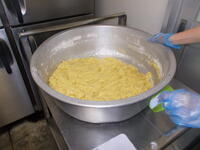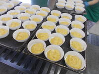 (卵が食べられない児童分は、ここで生地と梨を合わせてカップに入れて焼き上げます。)