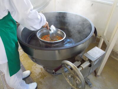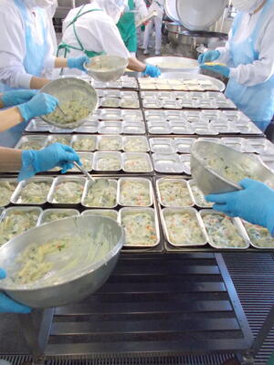 調理師さん達が、1つ1つ丁寧にホワイトソースをグラタン皿に入れて