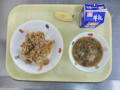 今日の給食は、お肉たっぷり「プルコギ風焼き肉丼」と