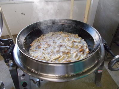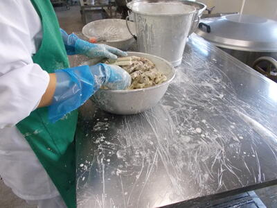 調理師さん達が、心を込めて1つ1つ包んで揚げました。
