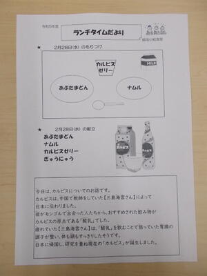 2024年2月の記事一覧 2024年2月 全ての記事 アーカイブ 2025年12月 (13) 2025年11月 (15) 2025年10月 (22) 2025年9月 (19) 2025年8月 (0) 2025年7月 (10) 2025年6月 (21) 2025年5月 (19) 2025年4月 (15) 2025年3月 (12) 2025年2月 (18) 2025年1月 (18) 2024年12月 (12) 2024年11月 (18) 2024年10月 (23) 2024年9月 (18) 2024年8月 (0) 2024年7月 (10) 2024年6月 (21) 2024年5月 (20) 2024年4月 (15) 2024年3月 (10) 2024年2月 (20) 2024年1月 (17) 2023年12月 (13) 2023年11月 (20) 2023年10月 (22) 2023年9月 (20) 2023年8月 (0) 2023年7月 (10) 2023年6月 (21) 2023年5月 (19) 2023年4月 (13) 2023年3月 (13) 2023年2月 (19) 2023年1月 (16) 2022年12月 (16) 2022年11月 (19) 2022年10月 (20) 2022年9月 (18) 2022年8月 (0) 2022年7月 (12) 2022年6月 (20) 2022年5月 (18) 2022年4月 (14) 1件 1件 5件 10件 20件 50件 100件 2/28(水)の給食 投稿日時 : 2024/02/28 一般 今日は、出汁が香るふわふわの「あぶたま丼」でした。 ご飯と一緒に食べるため、しょう油などの調味料の味付けがむずかしいのですが、 出汁の風味を残しつつ、ご飯がもりもりと進む味付けにしました!! 123456789 »