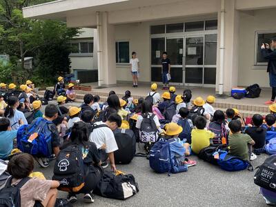 学校で出発式をすませた5年生は、林間学校の館山に向けて出発しました。