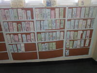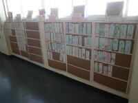 【本の紹介】あれっ?廊下に新しい本棚が・・・と思ったら、本の背表紙に見立てて各自が書いた本の紹介が、まるで本物の本棚みたいに掲示してあります。その上には、担任の先生の紹介の本も!