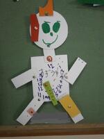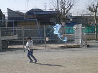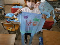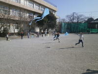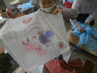 元気に校庭で凧あげに挑戦です。自分でお気に入りの絵を描いた凧が大空に舞い上がります。中には走り回って疲れてしまった子や、糸が絡まってしまった子もいましたが、皆、楽しそうでした。