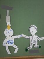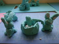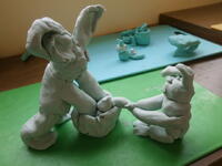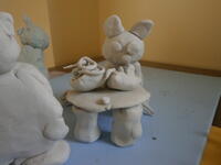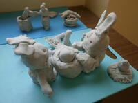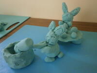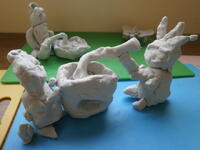 2年生の廊下に粘土で作った作品がありました。テーマは干支にちなんで『ウサギの餅つき』でしょうか?細かいところまで作られていて、力作ぞろいです。
