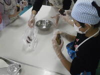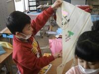アイロン、ミシンを使ってエプロンづくりに取り組んでいます。針に糸を通すのも真剣そのものです。