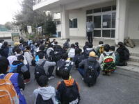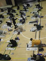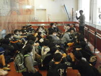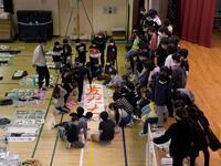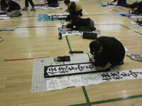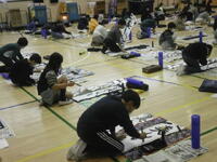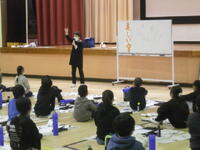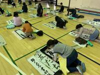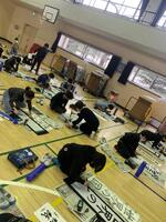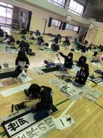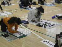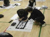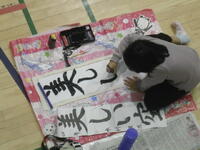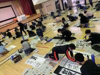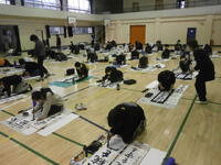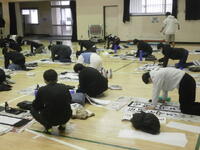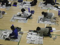 小雨の降る寒い天気ですが、4年生と6年生が体育館で書き初めを行いました。講師の先生に教わりながら、皆、真剣に筆を走らせています。