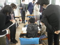 ICT支援員の先生に教わりながら、チームスの使い方を練習しています。1年生にとっては新しい発見も多く、驚きと操作できた時の喜びでいっぱいです。