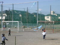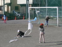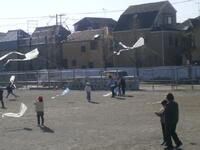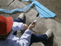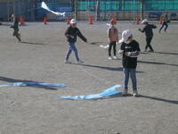 元気に校庭で凧あげに挑戦です。自分でお気に入りの絵を描いた凧が大空に舞い上がります。中には走り回って疲れてしまった子や、糸が絡まってしまった子もいましたが、皆、楽しそうでした。