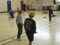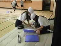 あいにくの雨降りなので体育館で縄跳びの授業です。いろいろな跳び方で何回跳べたか記録していきます。
