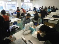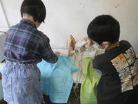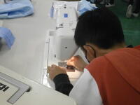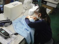 アイロン、ミシンを使ってエプロンづくりに取り組んでいます。針に糸を通すのも真剣そのものです。