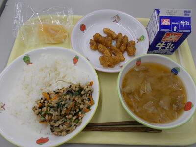 今日は、鮭わかめごはん・菊入磯和え・肉じゃが・市川の梨「豊水」と