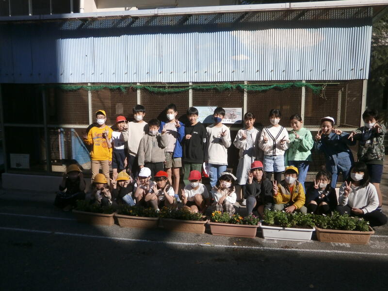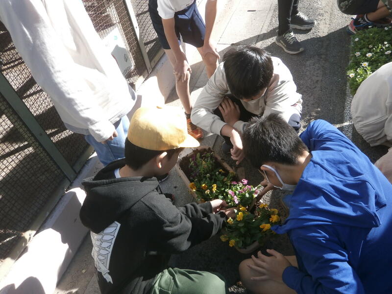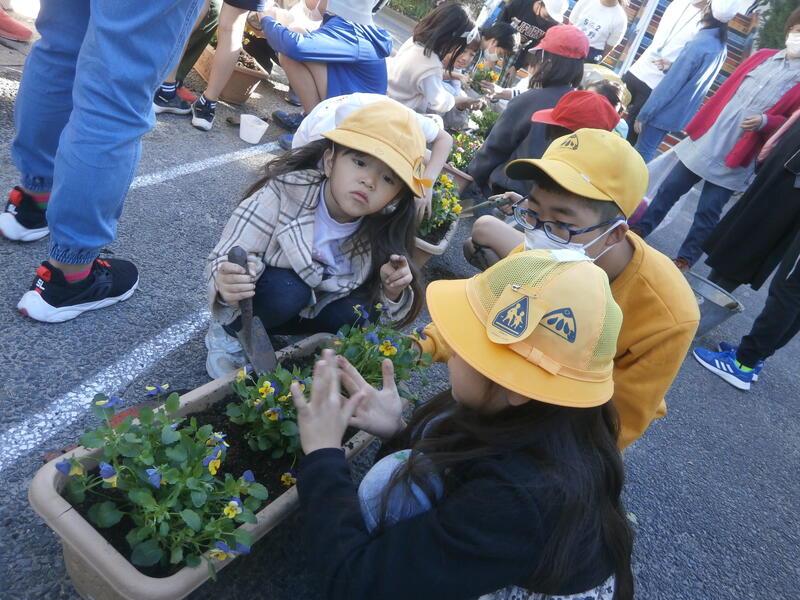 業間休みの時間に各クラス代表による「人権の花」の植え付けと