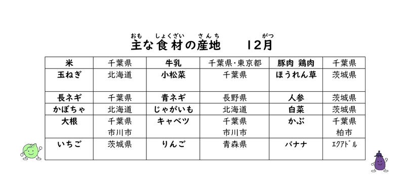 ☆~12月給食使用食材 産地のお知らせ~☆ 投稿日時 : 01/08 一般 1月の給食だよりに記載出来なかった、12月給食使用食材の産地をお知らせします。 2025年も、児童に楽しく美味しい給食の時間になれるように、 栄養士・調理師一同協力していきます。 よろしくお願いいたします。