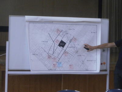 交通事故の心配な場所はピンク、防犯上問題ありそうな場所は黄色、防災上問題ありそうな場所は水色のふせんを貼りつけていきました。