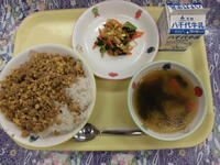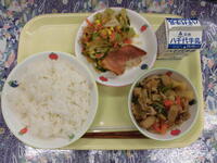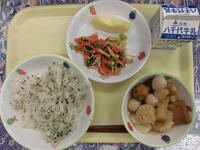 ごはん・鮭ふりかけ・山吹和え・生揚げの肉味噌煮・りんご・牛乳