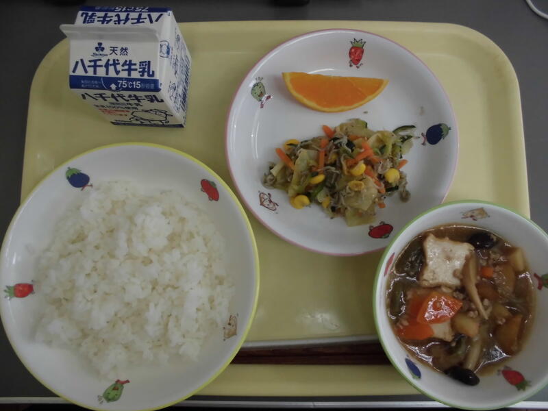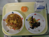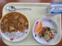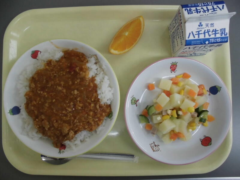 ・麦ごはん ・キーマカレー ・マセドアンサラダ ・オレンジ ・牛乳