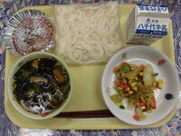 わかめうどん・こんにゃくサラダ・チョコチップマフィン・牛乳