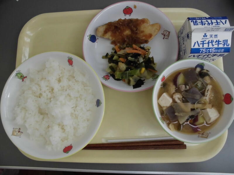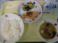 ・ごはん ・白身魚の薬味ソース ・わかめサラダ ・さつまみそ汁 ・牛乳