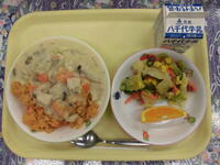 ・ごはん ・いかフライ ・ごまドレッシングサラダ ・のっぺい汁 ・ひとくちアセロラゼリー ・牛乳