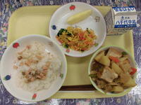 ・ごはん ・じゃこサラダ ・新じゃがのそぼろ煮 ・清見オレンジ ・牛乳