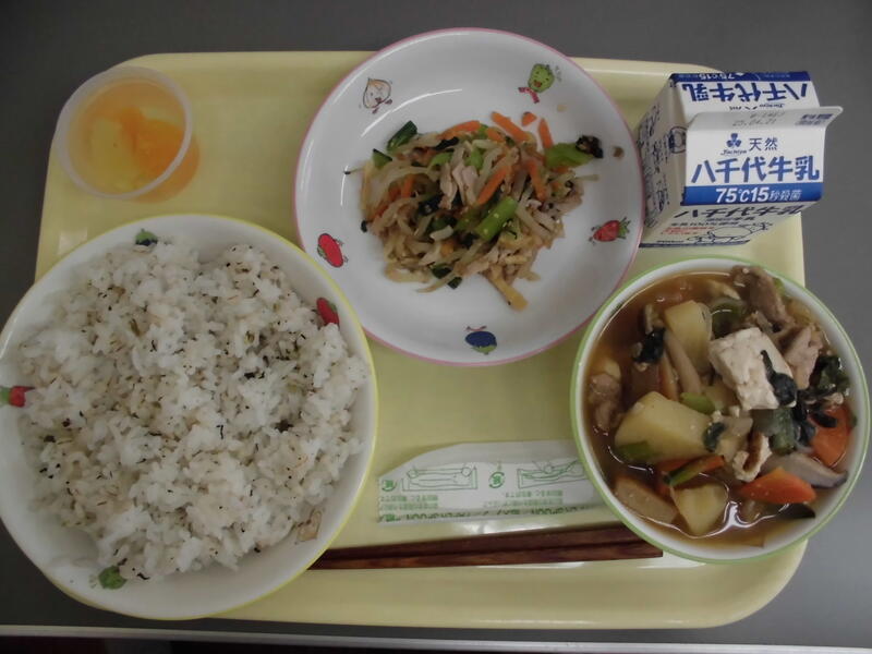 ・菜飯麦ごはん ・千草和え ・すき焼き風煮 ・フルーツゼリー ・牛乳