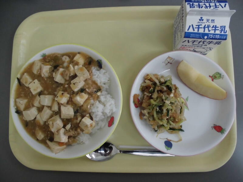 ・麦ごはん ・麻婆豆腐 ・バンバンジー ・りんご ・牛乳