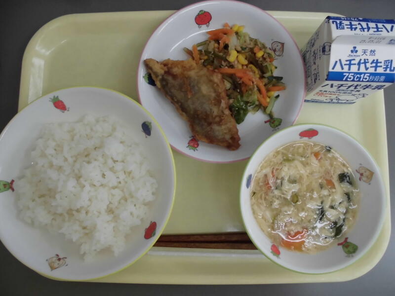 ・ごはん ・白身魚の竜田揚げ ・くきわかめとツナのサラダ ・かきたま汁 ・牛乳