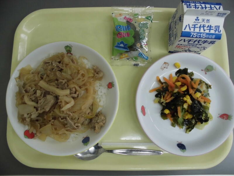 ・ごはん ・豚丼(具) ・わかめサラダ ・かしわもち ・牛乳