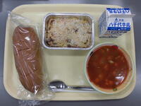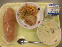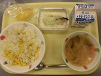 とうもろこしごはん・白身魚のチーズ焼き・ABCスープ・冷凍りんご・牛乳