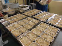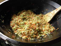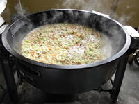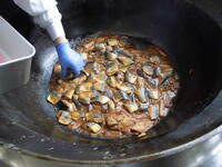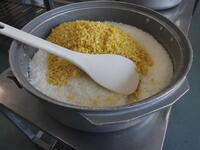 炊きあがったご飯にとうもろこしを混ぜている様子