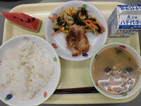 ごはん・鶏肉のバーベキューソース・わかめサラダ・田舎汁・すいか・牛乳