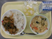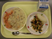 ごはん・キャベツメンチ・おかか和え・のっぺい汁・牛乳
