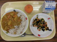麦ごはん・バターチキンカレー・わかめサラダ・冷凍みかん・牛乳