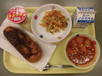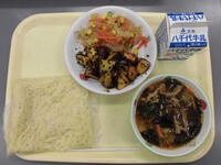 焼きそば・大豆とポテトのフライ・3種のわかめスープ・冷凍みかん・牛乳