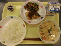 ごはん・白身魚の薬味ソース・菊花和え・かきたま汁・ひとくちぶどうゼリー・牛乳